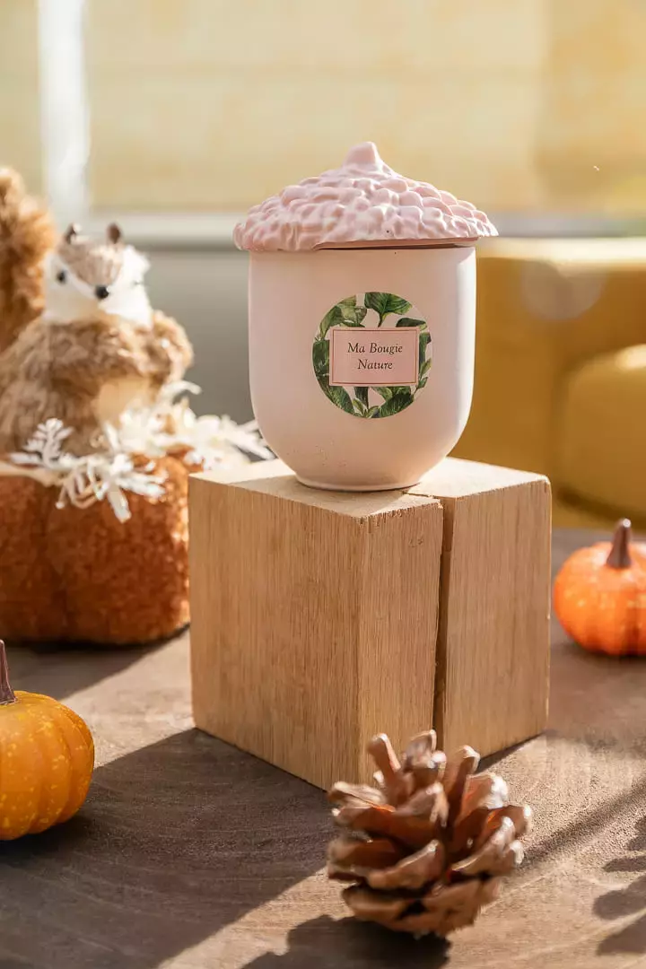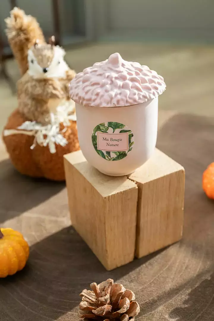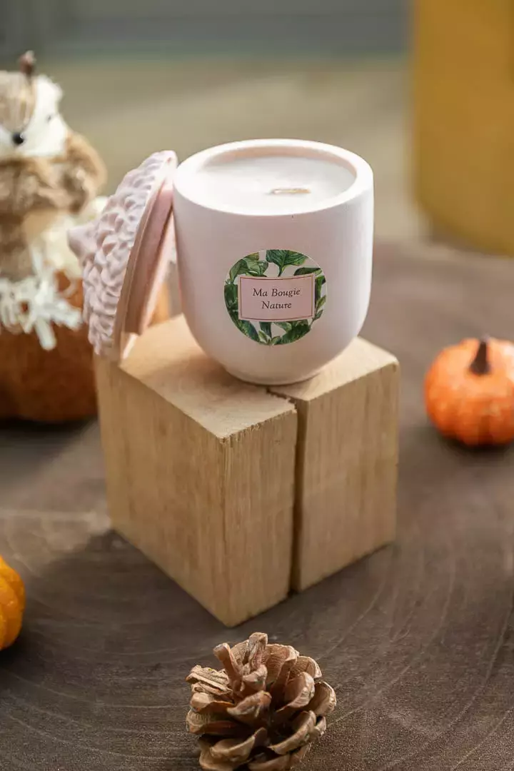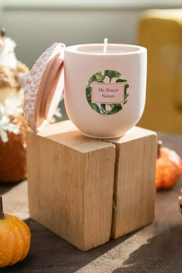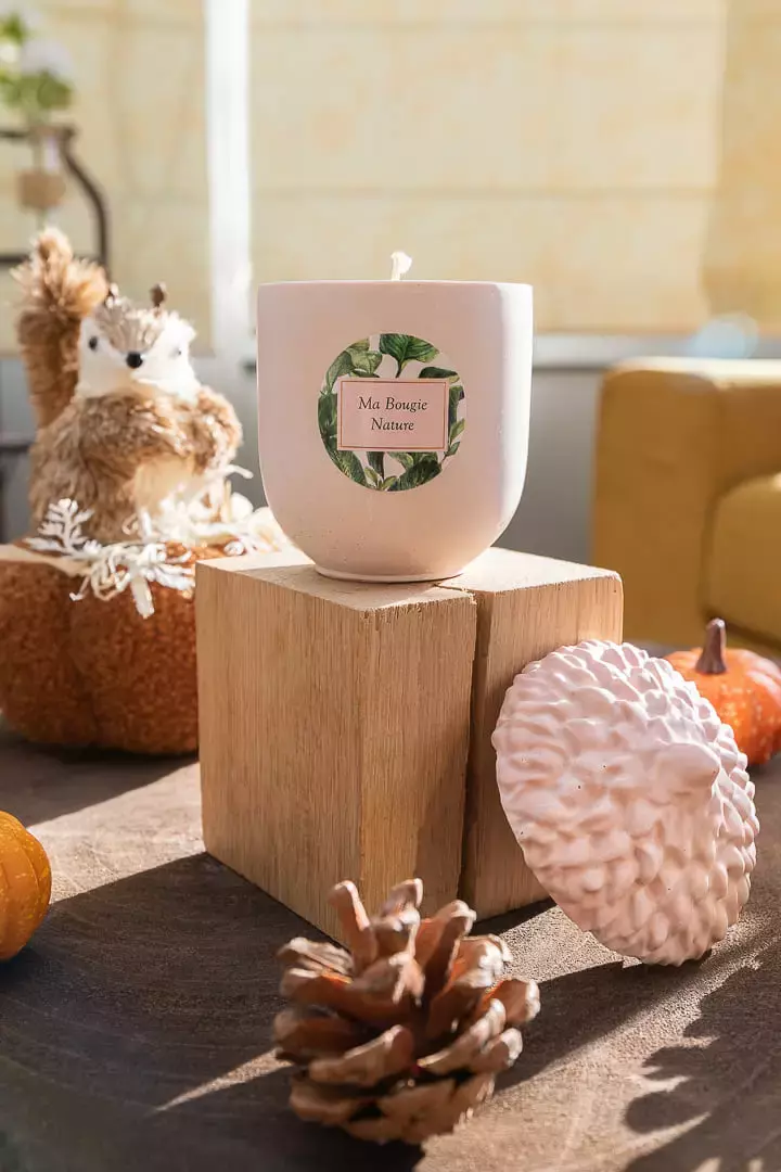 Dans un contenant fait main en jesmonite. Parfum : balade en forêt. Dimensions : diamètre 7,4cm x hauteur 8cm. Couleur de la cire : lin