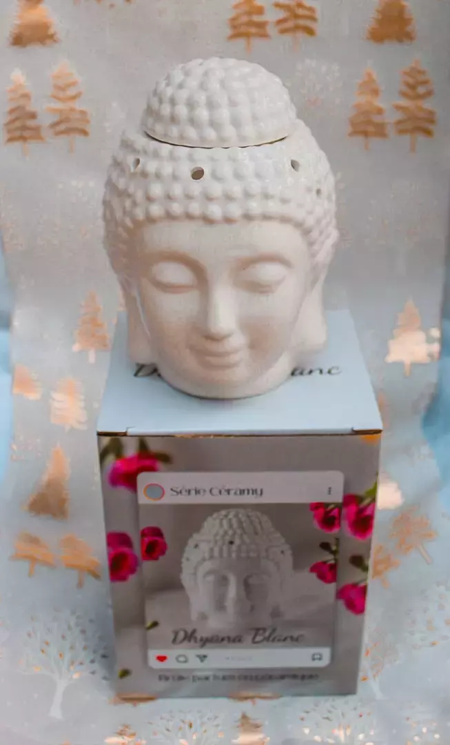 Bruleur parfum Dyana présenté dans une boite avec le dessin du bruleur. Dimensions de la boite : hauteur : 16cm; largeur : 10,8cm Prix : 14€.