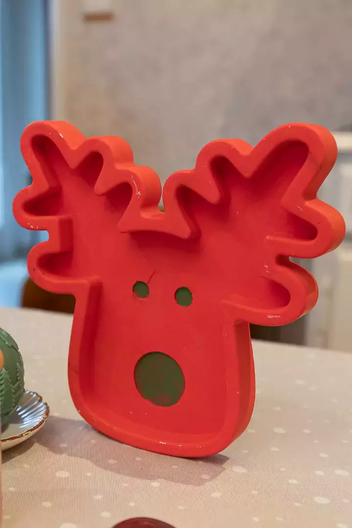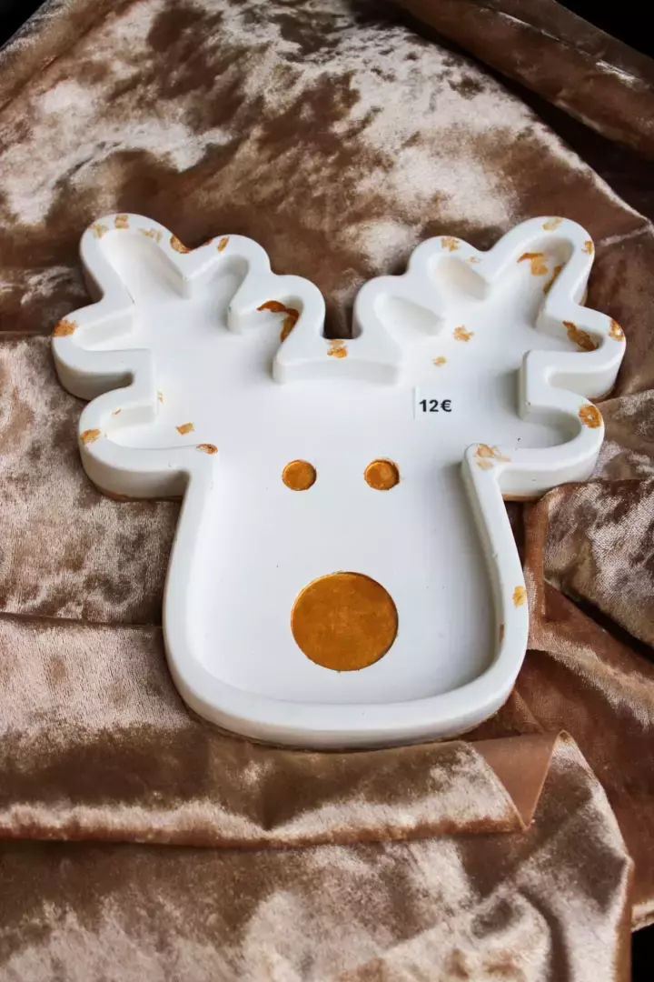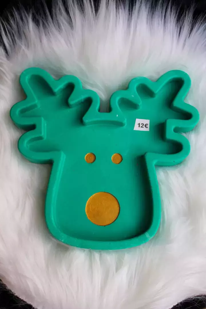 Cerf de couleur rouge, marron, vert ou blanc avec feutre de protection au dos. Il peut servir de petit plateau ou simplement d’élément décoratif. Longueur : 17 – largeur : 18,5 cm. Prix : 12 €.