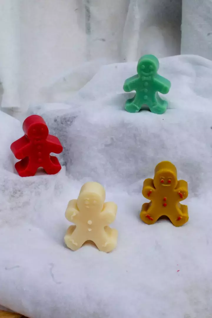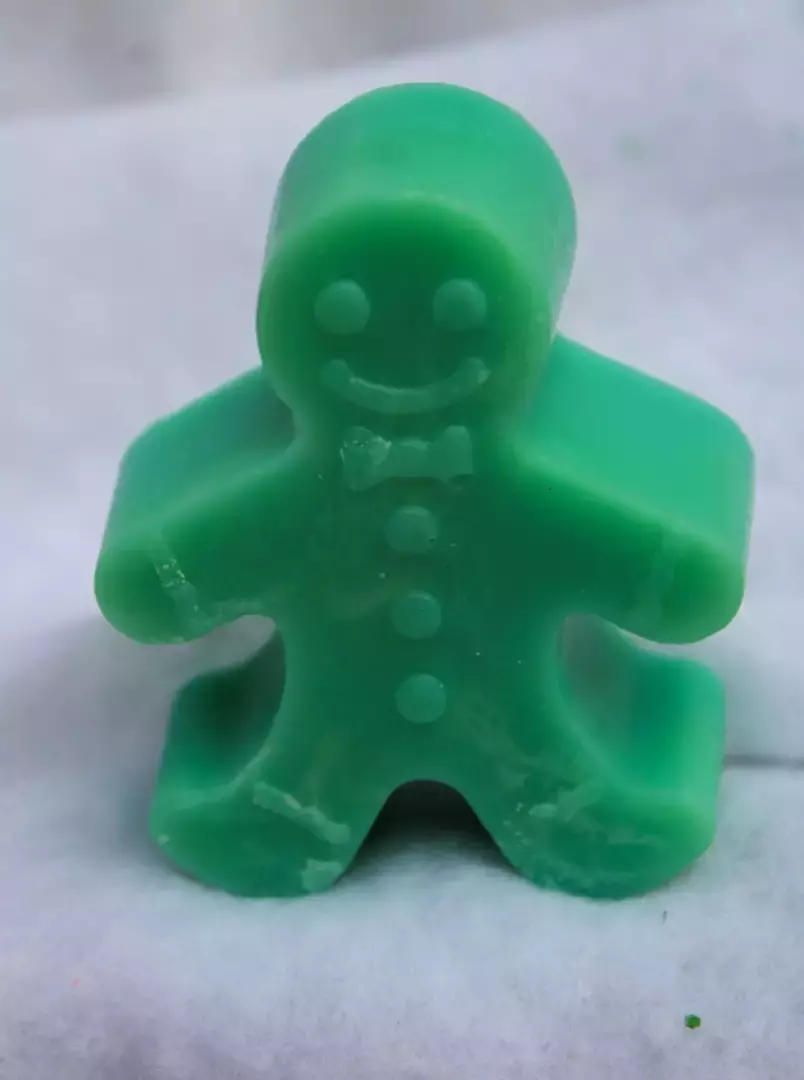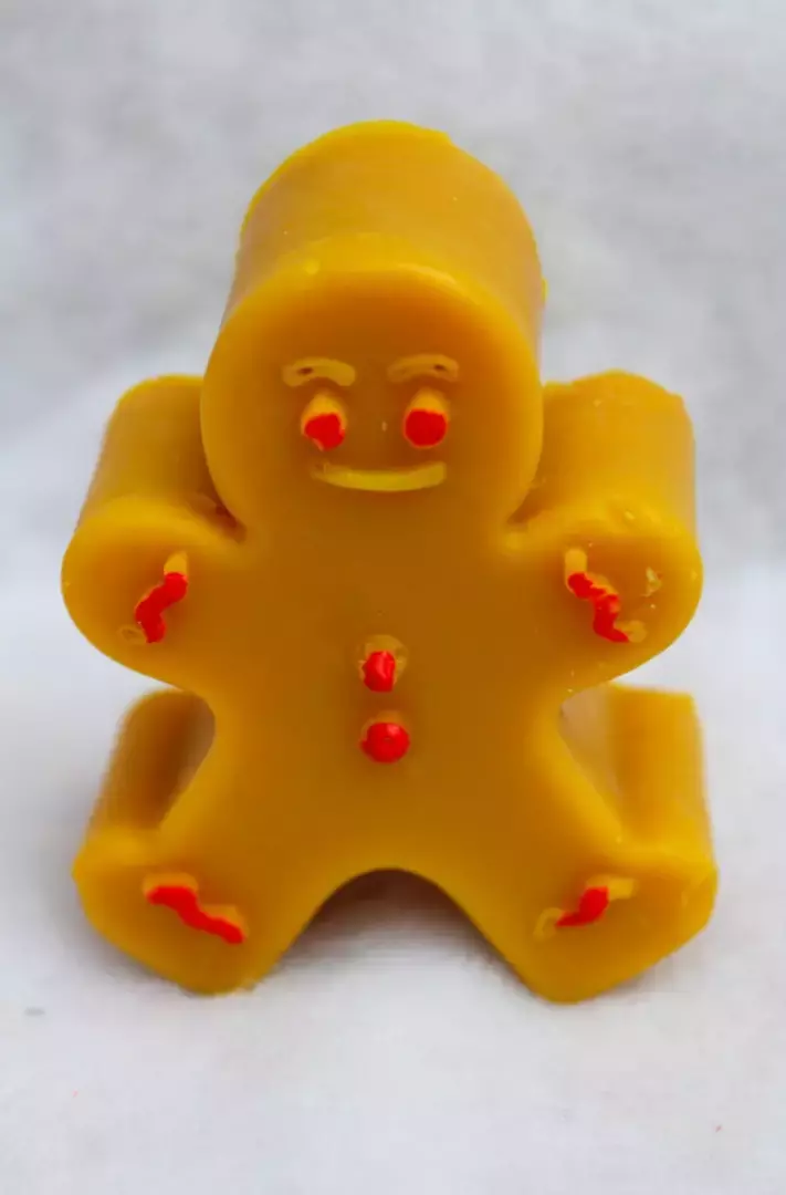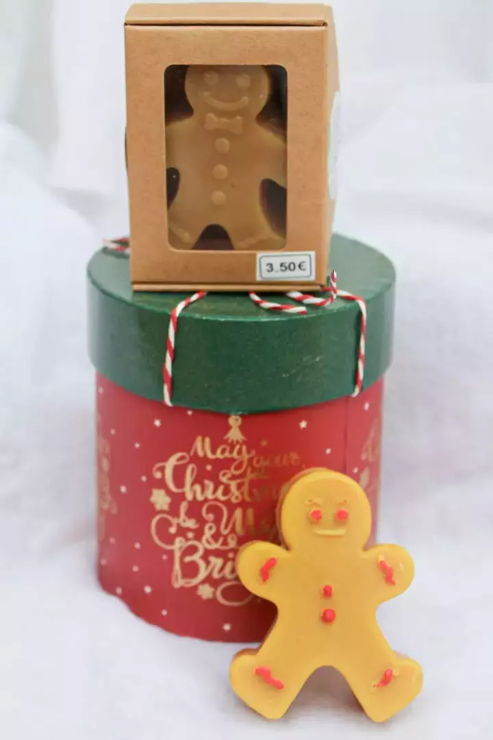 Petit bonhomme pain d’épice vert, marron, rouge ou blanc. Il peut servir de décoration de table. Poids : 60G. Prix : 3.50 €.