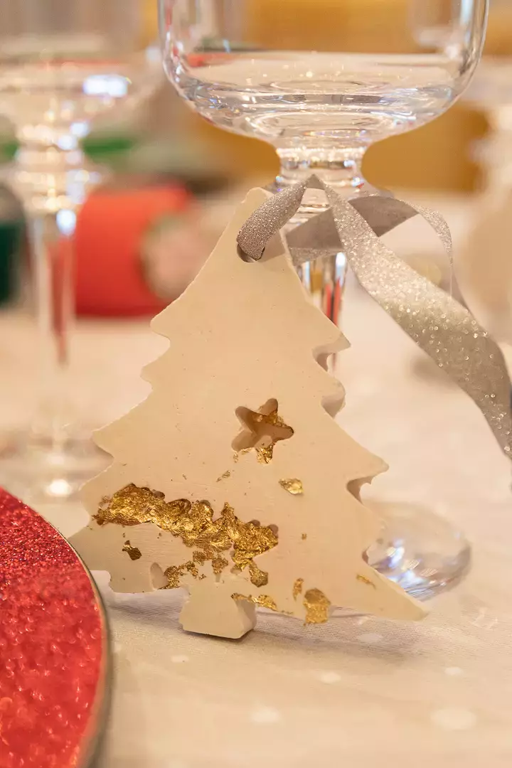 Fait main. Sapin de Noël : avec incrustation en feuille d’or sur l’inscription «Merry christmas ». Couleurs : blanc, vert, rouge, dimensions : largeur : 7,5cm sur 8,4cm. Poids : 52G